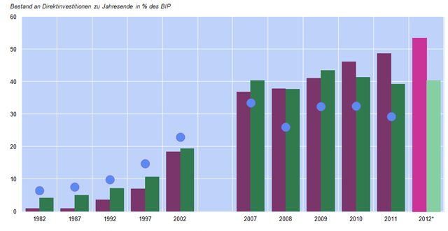 Bereits 2010 überstieg der Wert der österreichischen Unternehmensbeteiligungen im Ausland jenen internationaler Investitionen im Inland beträchtlich. Die aktuelle Statistik der Oesterreichischen Nationalbank (OeNB) lässt nun einen Trend zur Ausweitung dieser Nettoposition erkennen: Ende 2011 lagen Österreichs Beteiligungen bei 146,5 Mrd EUR und damit um 14 Mrd EUR höher als 2010, während die Verpflichtungen bei 118 Mrd EUR stagnierten.