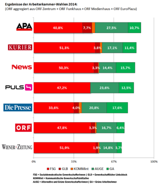 Das Ausmaß der Einseitigkeit lässt sich erst abschätzen, wenn man die Resultate der Arbeiterkammer-Wahl von 2014 betrachtet[1],[2]. Erstaunlich: Im ORF wählte man „nur“ zu 75% links (51% Rot, 23% Grün, 1% Kommunistisch), bei Puls4 waren es schon 83%, bei News 84% und beim Kurier 85%.
