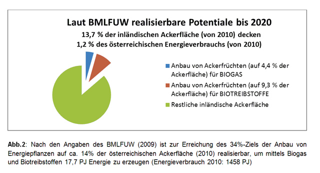 Die Ziele der Österreichischen Energiestrategie hinsichtlich der Nutzung von Bioenergie sind daher unrealistisch und bedeuten eine weitere Intensivierung der „guten landwirtschaftlichen Praxis“ (erhöhter Einsatz von Dünger, Pestiziden). Auch eine Nutzung von ökologisch wertvollen Flächen (z. B. Brachen oder Feuchtwiesen) sowie eine noch stärkere Auslagerung der Produktion von Nahrungs- und Futtermitteln ins Ausland, insbesondere in Regenwald- und Savannengebiete, sind zu befürchten.