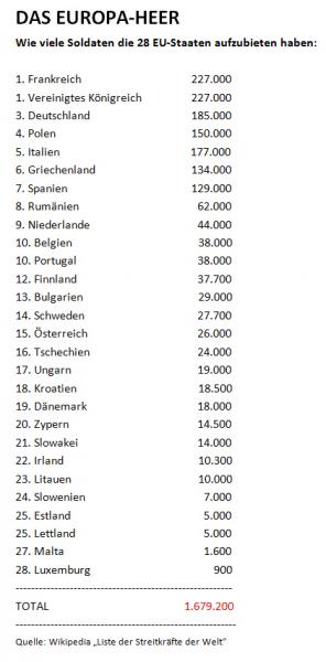 Im Jahr 2013 betrugen die weltweiten Rüstungsausgaben laut jüngstem Report des Stockholm International Peace Research Institutes (SIPRI) 1.747 Milliarden US-Dollar, was 2,4 Prozent des globalen Brutto-inlandsprodukts entsprach. Fast ein Drittel davon – 640 Milliarden – entfielen auf die Vereinigten Staaten, die damit weit vor der Volksrepublik China (188 Mrd.) und Russland (88 Mrd.) rangierten. Neben Saudi-Arabien, Japan, Indien und Südkorea waren auch drei EU-Staaten – Frankreich, das Vereinigte Königreich, sowie Deutschland – in den Top 10 vertreten. Wenn man allerdings die Heeresetats kumuliert, so lagen die west- und zentraleuropäischen Staaten mit 312 Milliarden US-Dollar auf Platz Zwei. Doch nicht genug damit: Die EU28 stellt insgesamt mit fast 1,7 Millionen Soldaten mehr als die USA (siehe Tabelle unten) – und lediglich die Volksrepublik kann mit 2,3 Millionen noch mehr aufbieten als die Union.