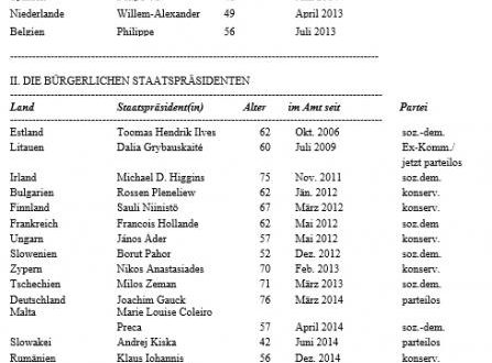 Mit Heinz Fischer, der seit 8. Juli 2004 in der Wiener Hofburg amtiert, tritt der dienstälteste Staatspräsident im EU-Raum ab. Er zählt zu einem exklusiven Zirkel von bürgerlichen Politikern, die in 21 Mitgliedsstaaten das höchste, wenn gleich zumeist nur repräsentative Amt innehaben.