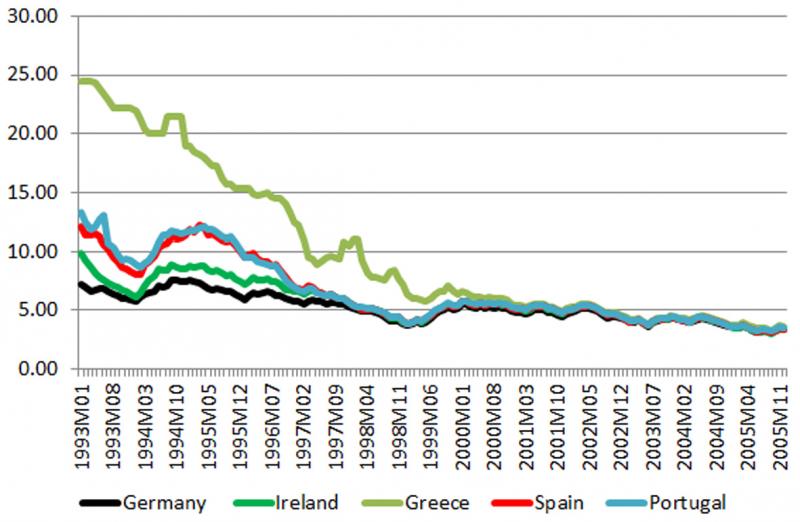 Vom Euro wurde also erwartet, die inflationären Tendenzen zu lindern sowie solide Fiskalpolitik und weitgehende Liberalisierungen zu fördern – was in den Jahren vor der Euroeinführung auch tatsächlich in den südlichen Eurozoneländern zu beobachten war.