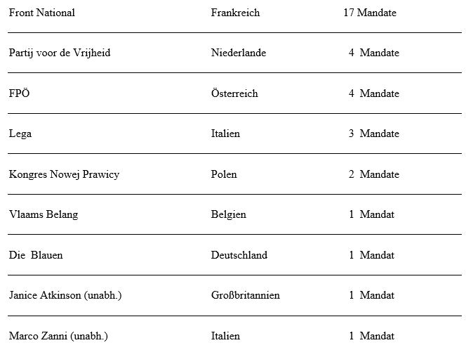 Der Front National, der in der französischen Nationalversammlung nur sieben von ingesamt 577 Abgeordneten stellt, und im Senat auf bloß zwei von 348 Sitzen kommt, wird zumindest EU-weit deutlich wahrgenommen, denn in der rechtspopulistischen Fraktion ENF spielt er zahlenmäßig die erste Geige (siehe Tabelle unten). In diesem nationalistisch gesinnten, ausländerfeindlichen, rechtsradikalen Sammelbecken sind obendrein auch 17 Mandatare aus sieben Staaten heimisch geworden, darunter die vierköpfige Delegation der Freiheitlichen Partei Österreichs, mit ebenfalls vier Sitzen die niederländische Partij voor de Vrijheid (PVV) sowie die italienische Lega (früher Lega Nord), für die deren heutiger Boss Matteo Salvini von Juli 2004 bis März 2018 mit kurzer Pause als MEP fungierte.