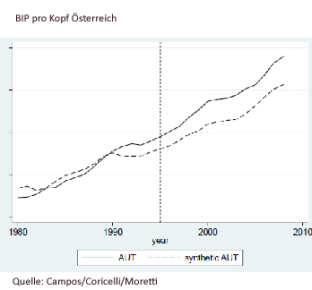Nun ist die Frage, was wäre geschehen, wenn ein Land zu seinem Beitrittszeitpunkt eben nicht beigetreten wäre, klarerweise nicht mit Sicherheit zu beantworten. Folglich kann jegliche Berechnung bestenfalls eine mehr oder weniger plausible Schätzung sein, die die Ökonomen zu erreichen versuchen, indem sie zu jedem Beitrittsland ein synthetisches Referenzland entwickeln. Dieses Referenzland ergibt sich aus einem Mix aus anderen Ländern, deren ökonomische Situation, gemessen an den für das Modell relevanten Variablen, möglichst genau dem Vergleichsland entspricht, nur dass diese Länder nicht gerade der EU beitreten. Dabei wird statistisch zudem auf Regionen herunter gebrochen, wobei für Österreich übrigens eine Kombination aus 11,2 % Australien, 27,4 % Kanada und 61,4 % der Schweiz herangezogen wurde.