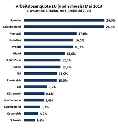 [[image1]]Elf Prozent aller Europäer waren im Mai 2013 arbeitslos gemeldet[1]. In Spanien und Griechenland waren es 27%, in Italien immerhin noch 12,2%. Besonders schlimm trifft es dabei die Jugend in den Krisenländern. Fast Vollbeschäftigung herrscht hingegen in der Schweiz (3,6%), in Österreich (4,4%) und in Deutschland (5,2%). An dieser Spreizung lässt sich Europas Krise – aber auch seine Chancen – ablesen.