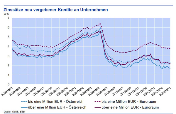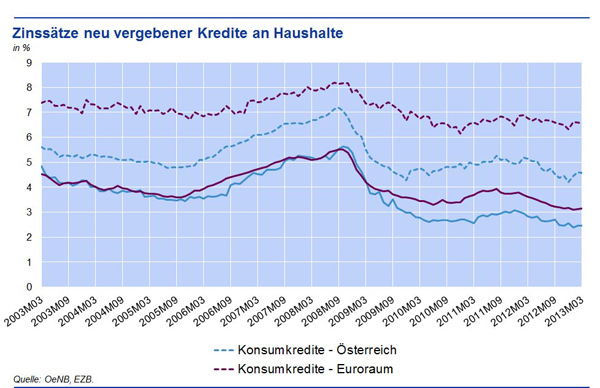 Österreich zählt derzeit zu jenen Ländern der Eurozone, in welchen private Haushalte und Unternehmen attraktive Kreditzinssätze vorfinden. Verglichen mit dem Euroraum-Durchschnitt wies Österreich im März 2013 einen Zinsvorteil bei privaten Haushalten von bis zu 1,98%-Punkten (bei Konsumkrediten) auf. Unternehmen fanden vor allem bei Krediten bis eine Million EUR – ein Segment, in dem vor allem viele Kredite an Klein- und Mittelunternehmen enthalten sind – deutlich bessere Konditionen als der Euroraum-Durchschnitt vor.