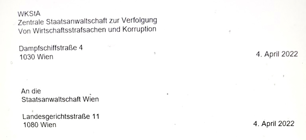 Gleich vier verschiedene Namen von möglichen Belastungszeugen werden in diesem Schreiben genannt, das an die Wirtschafts- und Korruptionsstaatsanwaltschaft (WKStA), an die Staatsanwaltschaft Wien und an das Bundeskriminalamt geschickt worden ist.