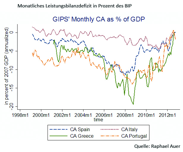 [[image1]]Für die finanzstarken Euro-Teilnehmer hatte die Eurozonenkrise bislang nicht nur Nachteile. So konnten angeführt von Deutschland Länder mit relativ hoher Produktivität nicht nur gegenüber den schwachen Eurozonestaaten sondern auch gegenüber dem Nicht-Euro-Ausland erhebliche Exportüberschüsse erzielen, liefen dabei bislang aber nicht Gefahr, ihre internationalen Wettbewerbsfähigkeit durch eine starke Aufwertung ihrer jeweiligen Landeswährungen zu verlieren. Denn dank der Schuldenproblematik in der südlichen Eurozone blieb der Euro trotz zunehmender Exportüberschüsse schwach, wodurch Länder wie Deutschland und Österreich die schwache Nachfrage im Inland und die einbrechende Konjunktur der Krisenländern mit steigenden Exporten in Länder außerhalb der Eurozone ausgleichen konnten.