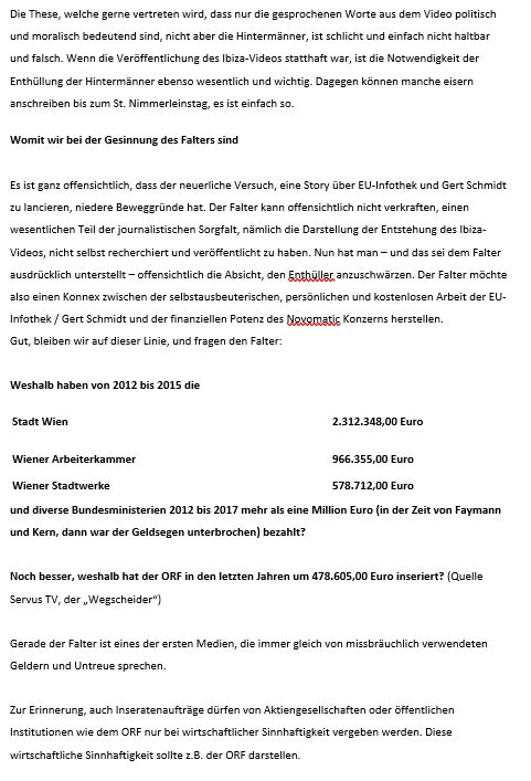 Beim FALTER, und damit auch bei Dr. Florian Klenk, handelt es sich nicht um ein „kleines Medium“, sondern um ein politisch höchst wirksames „Instrument“ der permanenten, oftmals überschießenden, sehr einseitigen Kritik an Parteien, Firmen und Personen. Diese Kritik zielt fast ausschließlich auf politische Mitbewerber, welche als Mitte-Rechts-Lager beschrieben werden. Genau aus diesem Grunde ist die Finanzierung dieser „Speerspitze der Moral und der Werte“ genau zu prüfen, woher die finanziellen Mittel stammen und mit welcher möglichen Absicht diese bereitgestellt werden.
