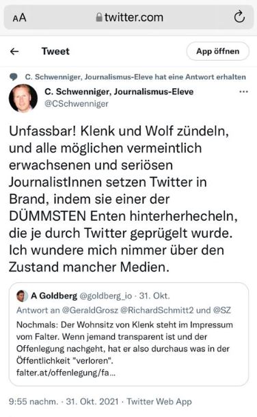 Sogar FALTER-Gründer Armin Thurnher meldet sich auf Twitter höchstwahrscheinlich direkt aus dem ihm zuzurechnenden Schloss Oberhöflein (siehe Google) in Niederösterreich mit gar nicht feudalen Worten.