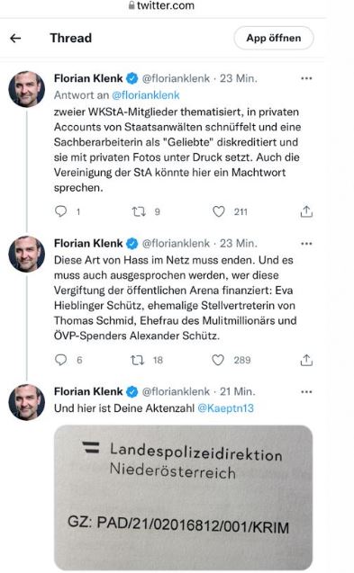 Am Abend des 01.11.2021 fühlte sich Dr. Klenk durch Twitter-Einträge so bedroht, dass er die Hilfe bei der Landespolizeidirektion Niederösterreich in Anspruch genommen hat.