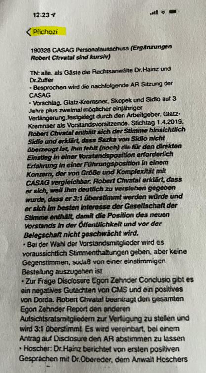 In diesen beschlagnahmten Unterlagen ist nunmehr ein verräterischer und wohl auch gerichtsfester Hinweis auf jenen Personenkreis dokumentiert, welcher anlässlich der streng geheimen, nur von wenigen leitenden Personen der CASAG-Gruppe geführten Sitzung des Personalausschusses der CASAG Zugang zu Gesprächsprotokollen und Gesprächsinhalten hatte.