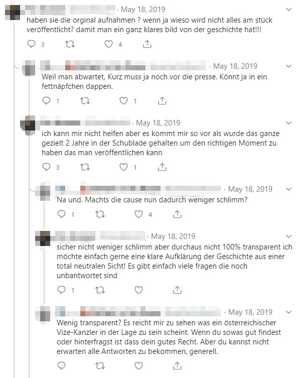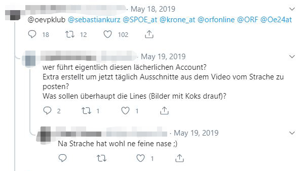 Das derzeit im österreichischen Parlament diskutierte Gesetz gegen „Hass im Internet“, mit der Auflage, verantwortliche Personen von den jeweiligen Internet-Giganten, wie Facebook oder Twitter, in Österreich zu benennen, gibt Hoffnung, dass zeitnah die Aufklärung über die Hintermänner des Ibiza-Videos und die Verantwortlichen dieses Twitter Accounts – dieses wurde am 17. Mai 2019 um 15:46:22 eröffnet, also Stunden vor der Veröffentlichung des Videos durch Süddeutsche Zeitung und Spiegel -, welche offensichtlich zusammengehören oder zumindest zusammenarbeiten, erfolgen wird.