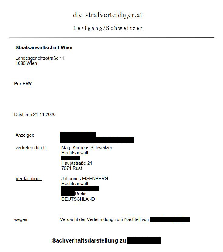 Gegen den Berliner Anwalt des flüchtigen „Detektivs“ Julian H. – gegen ihn wird wegen der Herstellung und Veröffentlichung des Ibiza-Videos sowie des Verdachts des Suchtgifthandels sowie wegen des Verdachts der Erpressung und weiterer Delikte ermittelt –, RA Johannes Eisenberg in Berlin, (Zitat: „Ich bin kein Doktor“) wurde nun bei der Staatsanwaltschaft in Wien Strafanzeige eingebracht.