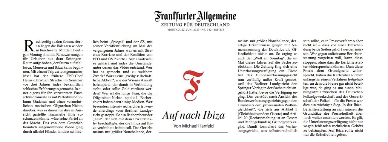 In einem Rechtsstreit zu einem Bericht über die sogenannte Ibiza-Affäre in Österreich hat der Medienkonzern Axel Springer einen Zwischenerfolg erzielt. Das Bundesverfassungsgericht setzte die Wirksamkeit eines Beschlusses des Landgerichts Berlin zu einer Unterlassungsverfügung vom Mai vorübergehend aus, wie aus dem Karlsruher Beschluss vom 17. Juni 2020 hervorgeht.