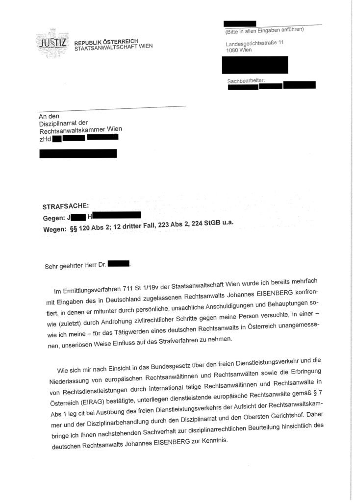 Rechtsanwalt Eisenberg – Zitat im oe24tv-Interview: „Ich bin kein Doktor“ (in Deutschland gelten weniger strenge Regeln, Anwalt zu werden, als in Österreich) – hat österreichische Richter, Staatsanwälte und Ermittlungsbeamte mehrmals verbal in ungehörigster Weise attackiert.