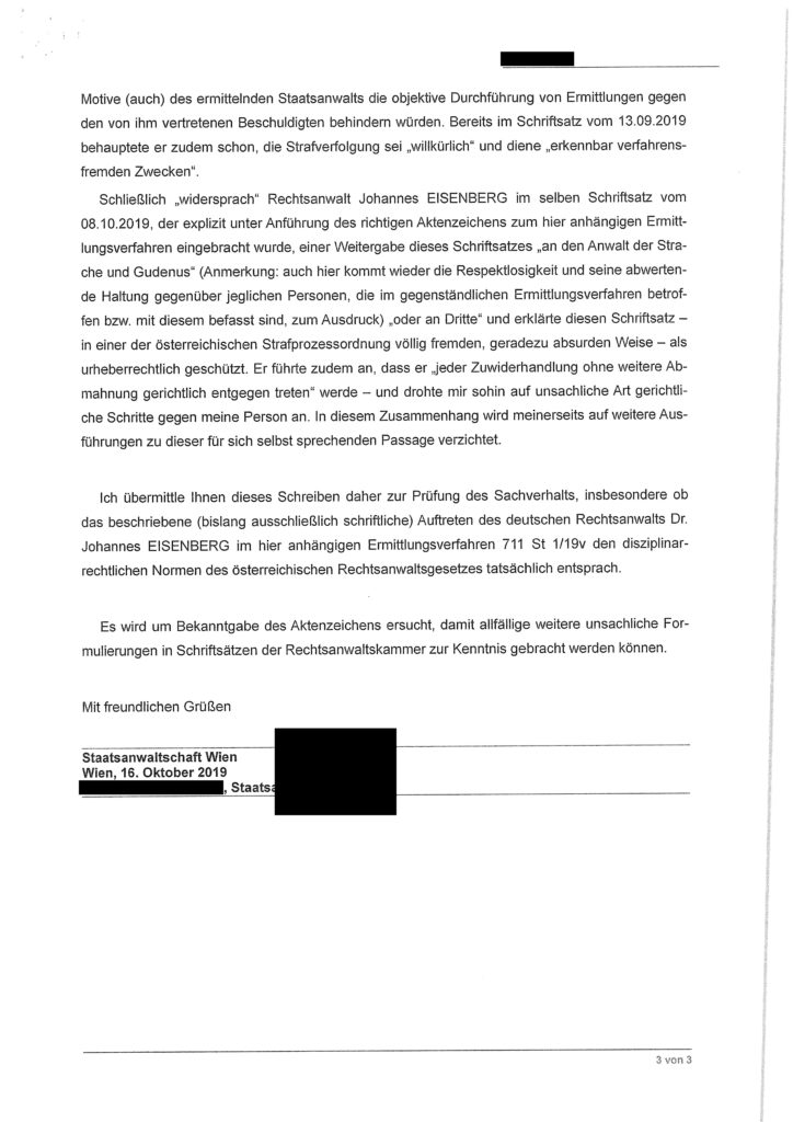 Sollte Eisenberg tatsächlich als Auskunftsperson zum Untersuchungsausschuss geladen werden, müssen sich alle Beteiligten bewusst sein, dass Sie damit einer Person, welche österreichische Behördenvertreter schriftlich beleidigt, eine Bühne zu weiteren Beleidigungen bieten und für diese dann unweigerlich einsetzende Rufschädigung österreichischer Behörden und auch Politiker nicht als „Aufklärer“ gelten können.