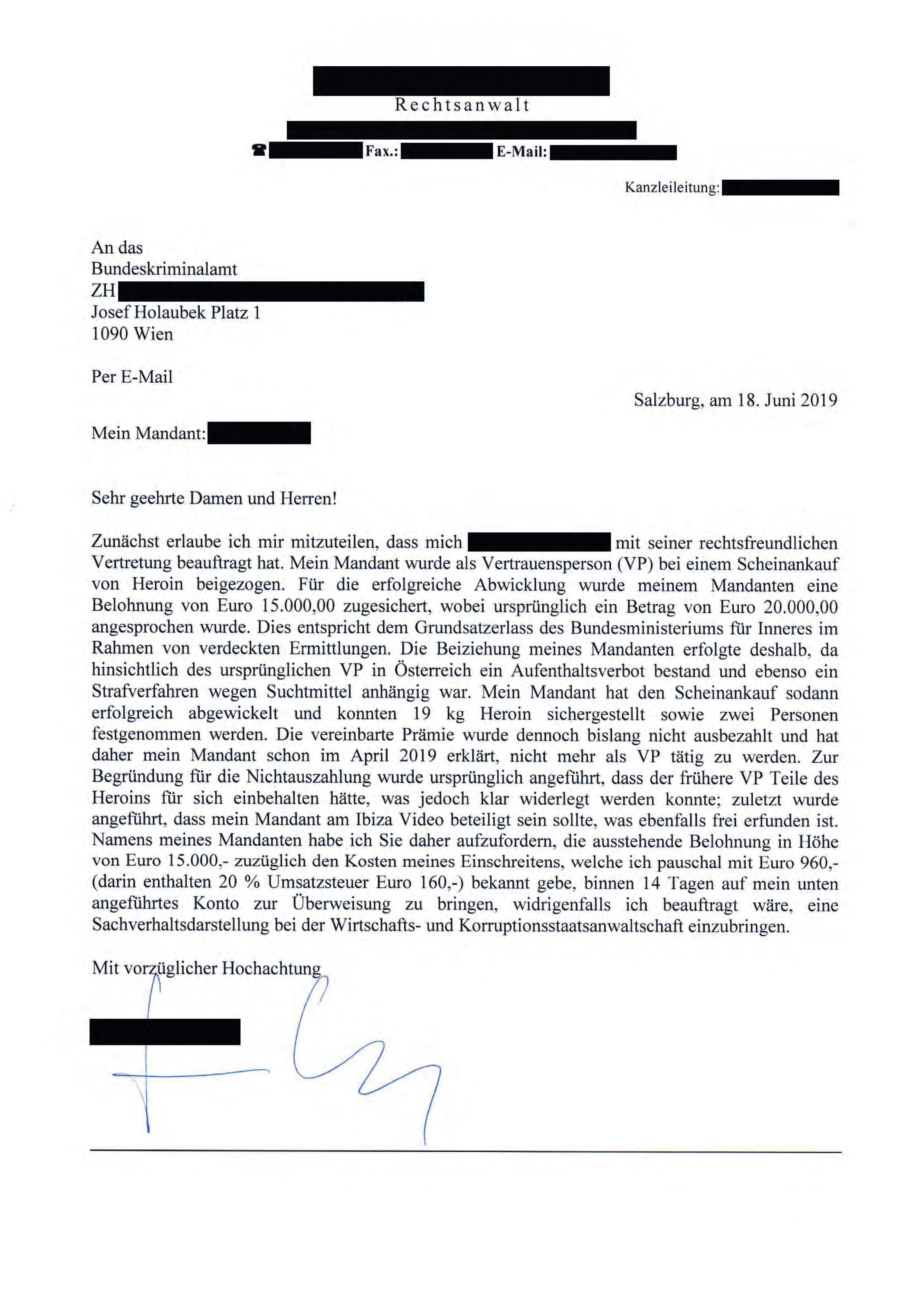 Im Juni 2019 schreibt der Rechtsanwalt des S.K., welcher derzeit von den BKA Beamten zum Beschuldigtenkreis der Ibiza Hintermänner gezählt und einvernommen wird, an das BKA und fordert für geleistete Informationsarbeiten seines Mandanten als V-Mann 15.000 Euro.