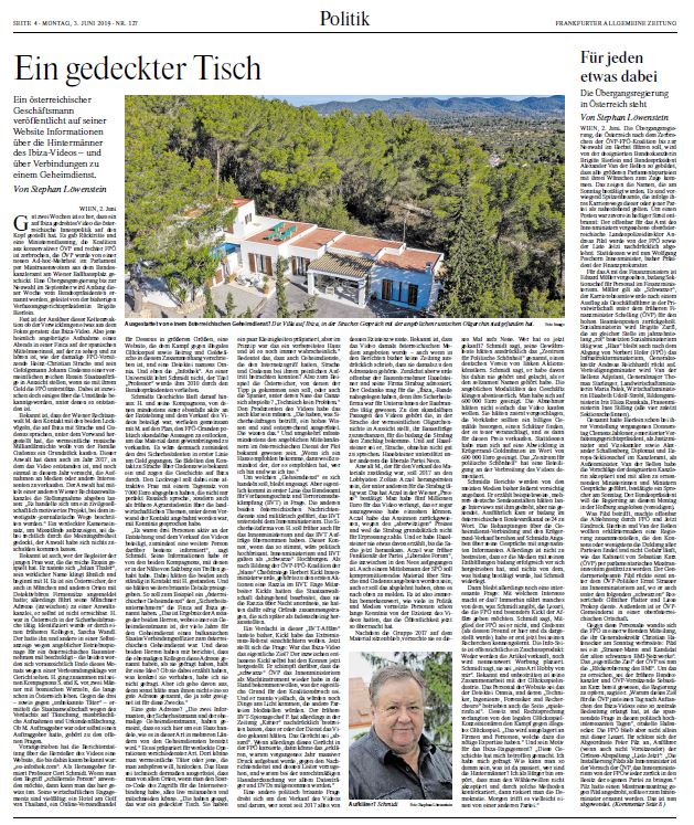 Die Frankfurter Allgemeine Zeitung (FAZ) – das Flaggschiff der deutschen Medien – berichtet auf Seite 4 der Printausgabe am 3. Juni 2019 über Ibiza-Gate.