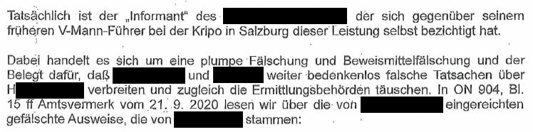 In seinen Schriftsätzen verrät RA Eisenberg, voller freudigem Eifer, sogar einen der offensichtlichen Hinweisgeber. Eisenberg erwähnt in seinem Schriftsatz sinngemäß, dass sich ein ehemaliger V-Mann des LKA Salzburg gegenüber dessen ehemaligen V-Mann Führer im LKA, den Beamten P., gerühmt habe, an der Enthüllung des Fälschers in Belgrad mitgewirkt zu haben. Dieser schriftliche Hinweis ist von besonderer Bedeutung, hat doch RA Eisenberg damit unfreiwillig Informanten aus Behördenkreisen preisgegeben, welche, anstelle des sogenannten Detektivs JH und sein kriminelles Netzwerk zu jagen, nichts anderes zu tun zu haben scheinen, also gegen die Enthüller des Ibiza-Skandals zu wirken. Der Hinweis im Schriftsatz des RA Eisenberg über das Gespräch zwischen ehemaligen V-Mann und seinem ehemaligen V-Mann-Führer im LKA Salzburg ist – das sei hier ausdrücklich festgehalten – richtig. Es gab dieses Gespräch zwischen den beiden im Laufe des Oktober / November 2020 tatsächlich.