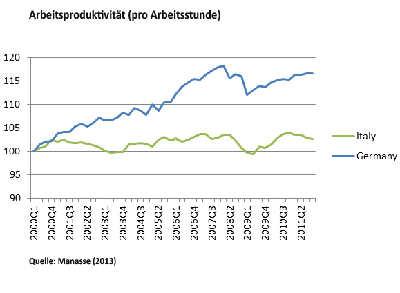 Dass dabei nun aber wie geplant auch die Mehrwertssteuer gesenkt werden soll spricht allerdings dafür, dass sich Italien wenig um die Probleme schert, die Italien erst in diese Situation gebracht haben. So liegt der Kern der Misere laut Paolo Manasse, Ökonom an der Universität Bologna, an einem „verlorenen Jahrzehnt“, in dem Italien gegenüber seinen wichtigsten Handelspartnern massiv an Wettbewerbsfähigkeit verloren hat. Demnach stieg der Index der Arbeits-Stückkosten in Italien zwischen 2001 und 2011 um 23 Prozentpunkte während er in Deutschland um 9,7 Prozent zurückging. Der Grund dafür lag allerdings nicht an den durchschnittlichen Arbeitskosten, die in Deutschland vor zehn Jahren noch fast doppelt so hoch waren wie in Italien. Diese sind in Italien seither zwar nominell um 39,5 Prozent und damit doppelt so stark gestiegen wie in Deutschland, nur ist in Italien die Arbeitsproduktivität in diesen zehn Jahren mit plus 2,7 Prozent praktisch stagniert, während sich Deutschland immerhin um 16,7 Prozent verbessern konnte. In der Konsequenz stiegen die Stückkosten (um Steuern bereinigt) um 32,3 Prozent stärker als in Deutschland, was nun zwar in etwa den typischen Entwicklungen in den Zeiten der Lira entspricht, diesmal aber nicht durch die routinemäßig Abwertung der Lira ausgeglichen werden konnte.