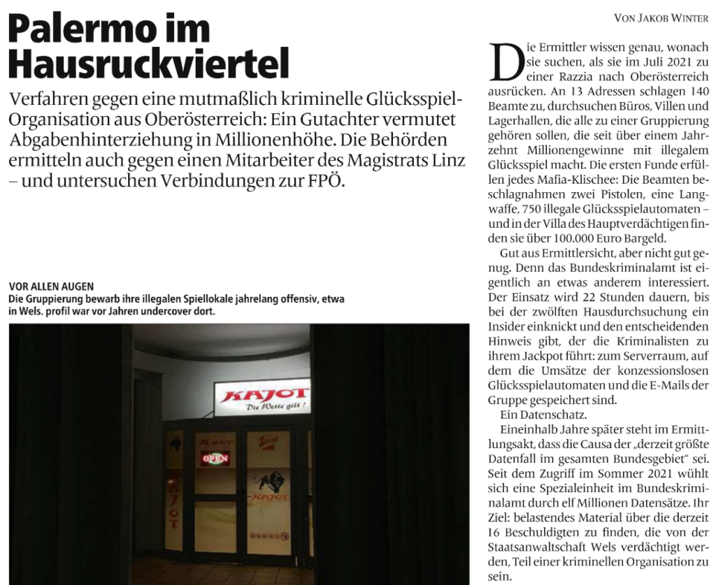 PROFIL berichtete in seiner Ausgabe vom 8. Jänner 2023 über „Palermo im Hausruckviertel“. Unternehmen dieser Firmengruppe wurden in den vergangenen Jahren jeweils dutzende Male wegen verschiedenen Delikten in Zusammenhang mit illegalem Glücksspiel angezeigt und erhielten insgesamt Verwaltungs- und Gerichtsstrafen in Millionenhöhe. Diese Strafverfahren sind den Behörden bekannt.