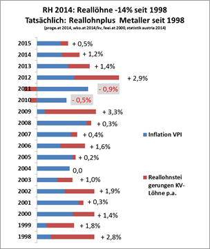 Um 14% sollen die Realeinkommen österreichischer Arbeiter seit 1998 gesunken sein? Wer ein bisschen was von Wirtschaft versteht, der weiß, dass sich die Gewerkschaft bei der jährlichen Lohnrunde nicht einmal an den Verhandlungstisch setzt, wenn nicht von vorherein klar ist, dass die Inflationsrate abgegolten wird. Gefeilscht wird immer nur um den Teil des darüber hinausgehenden Produktivitätsfortschrittes.