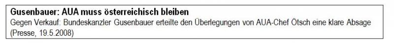 Um bei seiner Klientel zu punkten, verhinderte Gusenbauer (SPÖ) den Verkauf der AUA, als man noch Geld bekommen konnte. „Luftfahrtexperte“ Michael Häupl (SPÖ) sah gar „große Chancen für eine österreichische Lösung“. Dafür bekamen beide großes Lob von Fellners „Österreich“ und Dichands Kronenzeitung. Die AUA blieb also österreichisch − und ging dermaßen Pleite, dass die Republik dem Käufer, der deutschen Lufthansa, dann sogar noch 500 Millionen Euro bezahlen musste, damit sie sie überhaupt noch nahm. Massenweise Steuergeld vernichtet – und nicht einmal ein „Sorry – ging daneben!“ – Von Haftung, Gerichtsverfahren oder Privatkonkurs ganz zu schweigen.
