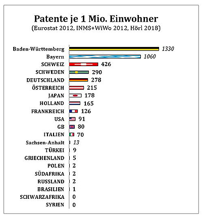 - Und er ändert sich: In England werden heute nur mehr 80 Patente je 1 Mio. Einwohner angemeldet, in der Schweiz sind es 426, in Deutschland 278 (davon in Baden-Württemberg 1.300), in Österreich 215, in Griechenland 5, in Bulgarien 3, in Syrien und Schwarzafrika je 0 [6].