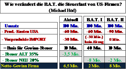 Es sei denn… man würde die ehemaligen Importe von 30 Mio. Dollar nun aus dem US-Inland beziehen („B.A.T. II“). Dann könnte man (wie früher) die vollen 90 Mio. von den Umsätzen abziehen. Von den 10 Mio. Gewinn müssten jetzt auch nur mehr 20% Steuern berappt werden, der Nettogewinn stiege auf 8 Mio..