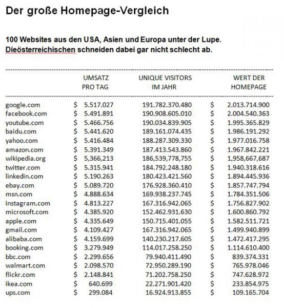 Als großer Sieger in diesem Welt-Ranking geht die Suchmaschine Google hervor, die jährlich 191 Milliarden Unique Visitors verzeichnet und auf einen täglichen Umsatz von 5 Millionen US-Dollar eingeschätzt wird. Ihre Site wird mit zwei Milliarden Dollar bewertet. Der von Larry Page und Sergey Brin gegründete Konzern in Mountain View/Kalifornien, in der „Fortune 500“-Liste auf Rang 40 gelistet, setzte zuletzt mit 53.600 Beschäftigten 71 Milliarden Dollar – ein Plus von 17 Prozent – und durfte sich über einen Profit in Höhe von 14,4 Milliarden freuen. Sein gesamter Marktwert liegt etwa bei 377 Milliarden Dollar (Stand: 31.03.2015) – womit bewiesen ist, dass die Homepage nur einen winziger Detailaspekt darstellt.