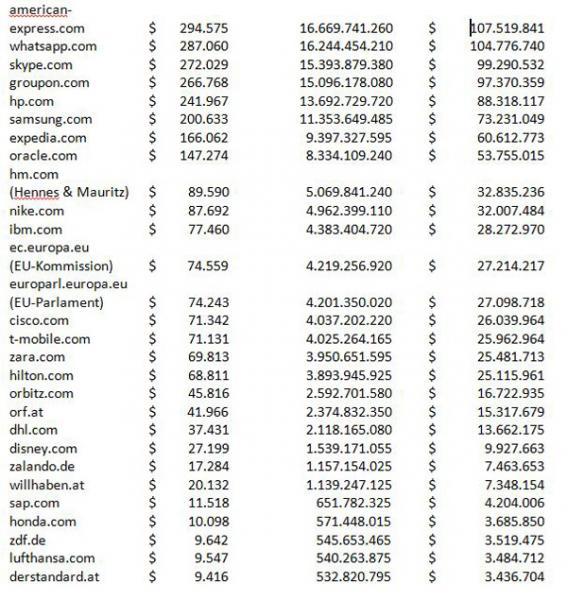 Nach den erfolgreichsten Suchmaschinen, Social Networks, E-Com- merce-Riesen und der Web-Enzyklopädie Wikipedia folgen etwa – mit Respektabstand – die mit 485 Milliarden US-Dollar Umsatz größte Firma der Welt (auf Platz 137) sowie sehr berühmteste multinationale Technologie-Companies: etwa Microsoft als Nummer 46, Apple an Position 48, Hewlett Packard erst an der 299. Stelle. Deren Bewertung fällt jedoch schon wesentlich bescheidener aus: Apple beispielsweise, das gemäß Börsenkapitalisierung wertvollste und umsatzmäßig fünfzehntgrößte Unternehmen am Globus, kommt lediglich auf 1,5 Milliarden Dollar. Die am höchsten eingestuften europäischen Websites gehören Ikea (Platz 195, Wert: 234 Millionen Dollar) und Hennes & Mauritz (Rang 525, Wert: nur noch fast 33 Millionen Dollar).