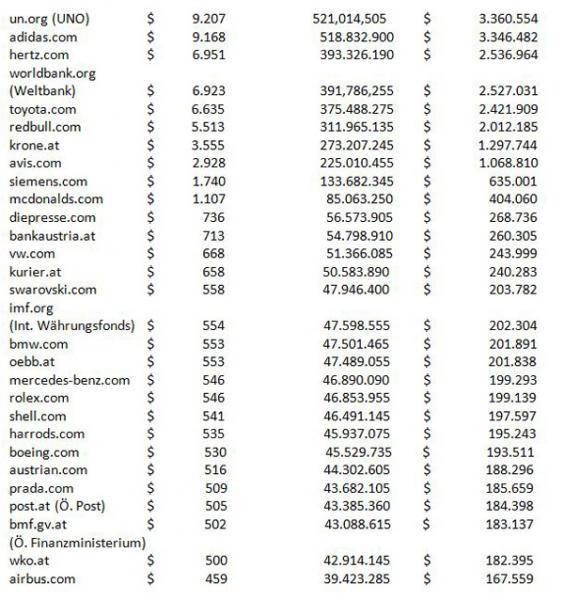 Der Internet-Auftritt der EU-Kommission (ec.europa.eu) und die Website des Europa-Parlaments (europarl.europa.eu) rangieren laut Alexa weit abgeschlagen auf den Plätzen 810 bzw. 816 und werden jeweils mit 27 Millionen US-Dollar ausgepreist. Immerhin schneiden die beiden um Häuser besser ab als die Netz-Präsenz von UNO, Weltbank und Internationalem Währungsfonds. Und wo rangiert Österreich? Von den rot-weiß-roten Homepages können vor allem der ORF (orf.at), willhaben.at, derstandard.at, redbull.com und krone.at halbwegs mithalten: Sie spielen immerhin in derselben Liga wie der Disney-Konzern, die Lufthansa oder Toyota und halten bei einem – freilich nur theoretischen – „Marktwert“ zwischen 15,3 und 1,3 Millionen Dollar. Eine noch deutlich geringere Netz-Affinität wird u.a. dem Kristall-Spezialisten Swarovski, den ÖBB, Austrian Airlines, den beiden Möbelriesen Kika und XXXLutz sowie den heimischen Industriekonzernen Voestalpine und OMV attestiert: Deren Websites werden in der Bandbreite zwischen rund 200.000 und 25.000 Dollar eingestuft. Interessant jedoch, dass beispielsweise Swarovski auf Rang 11.039 sensationellerweise noch vor internationalen Topkonzernen wie Mercedes- Benz, Rolex, Shell und Boeing platziert ist.